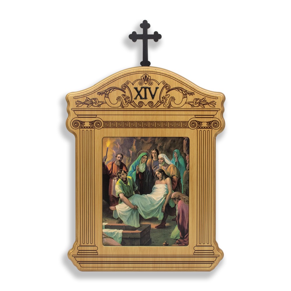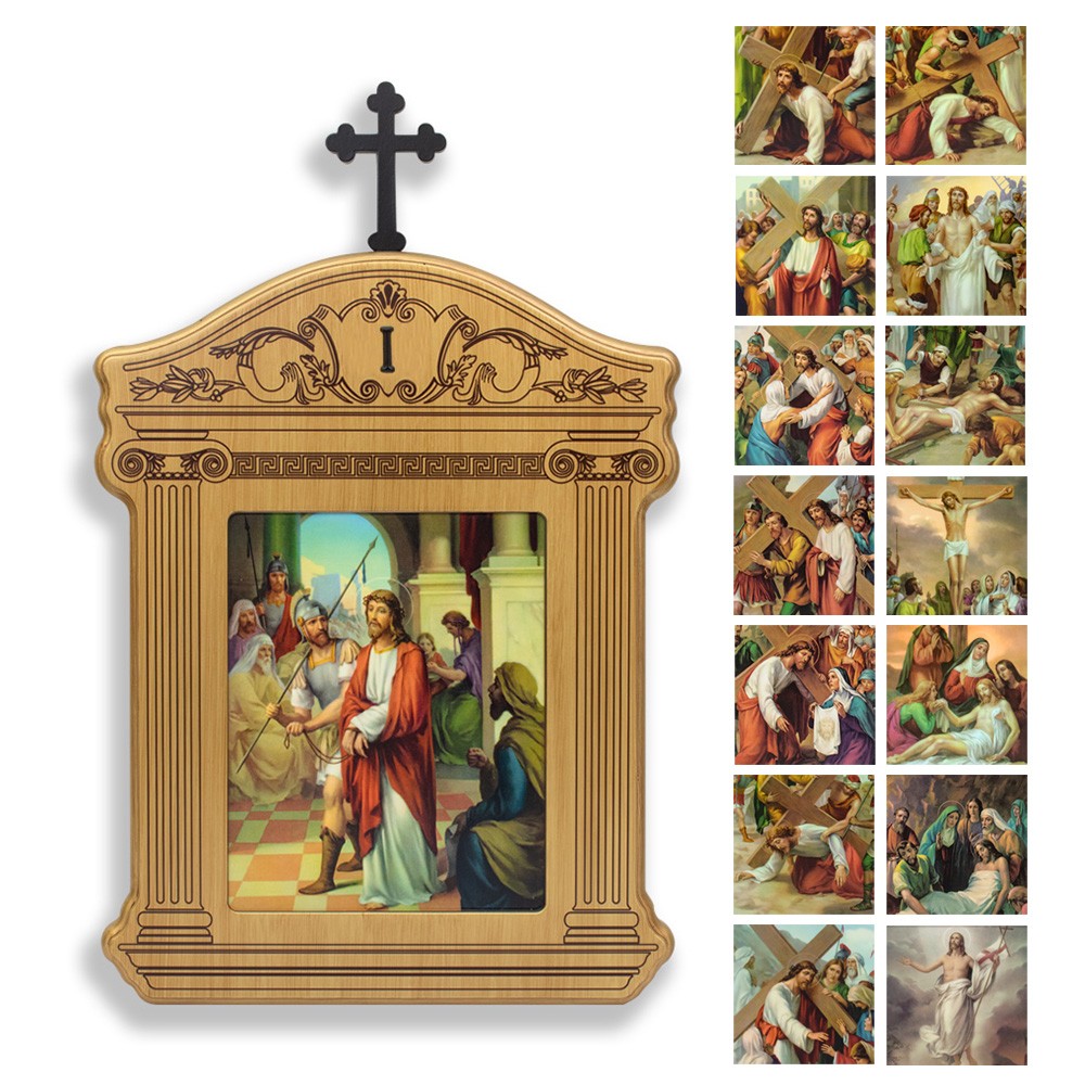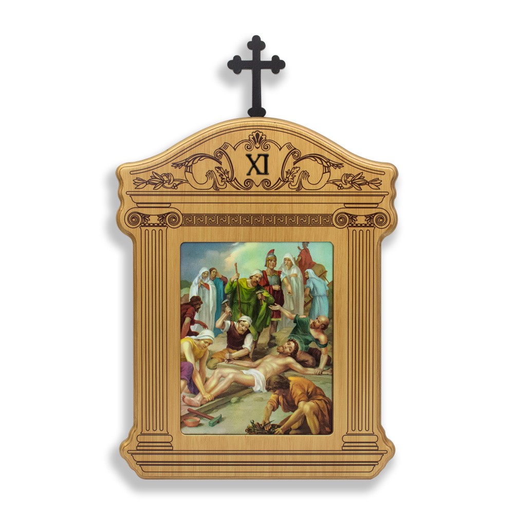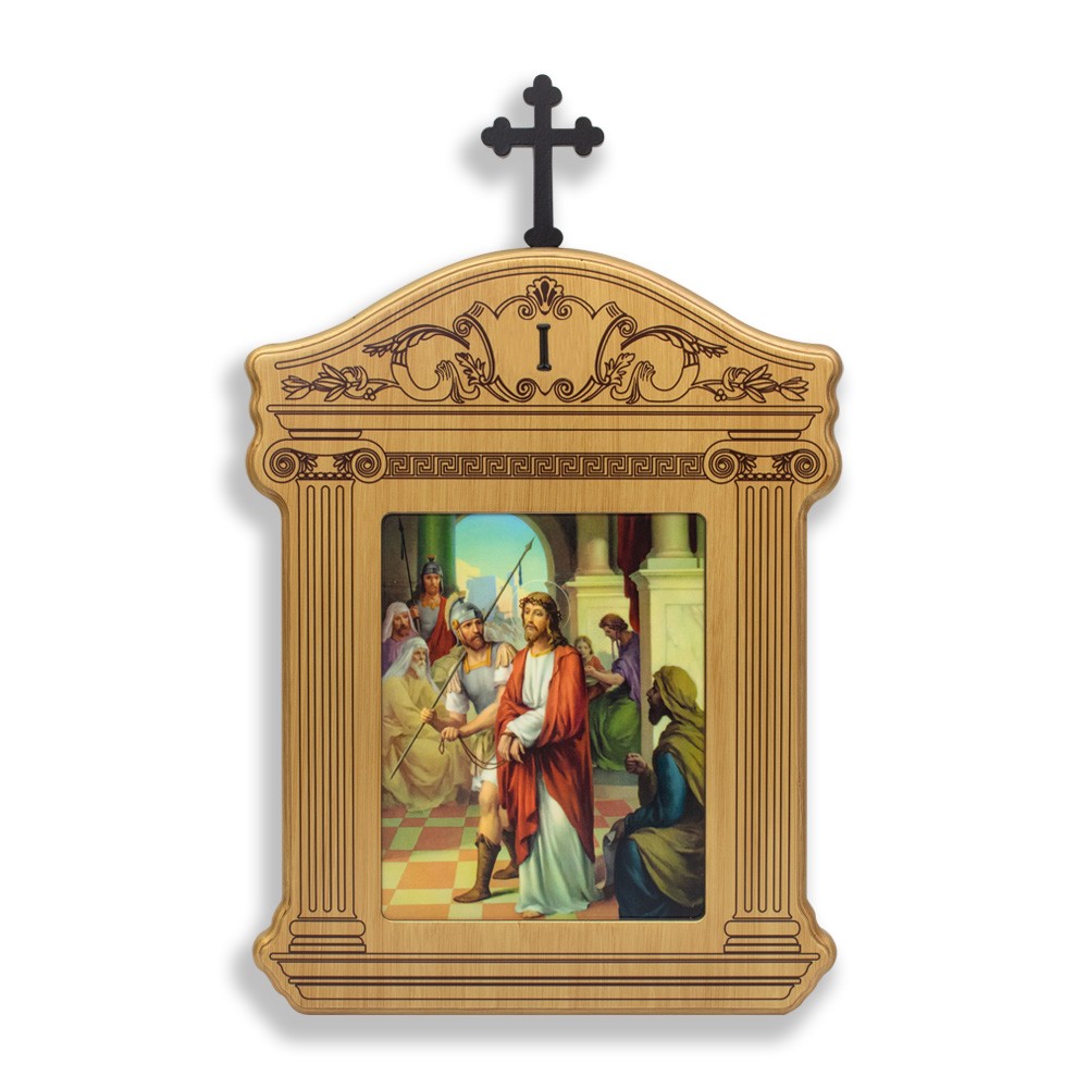 Way of the Cross printed on molded wood boards with the shape of a temple.