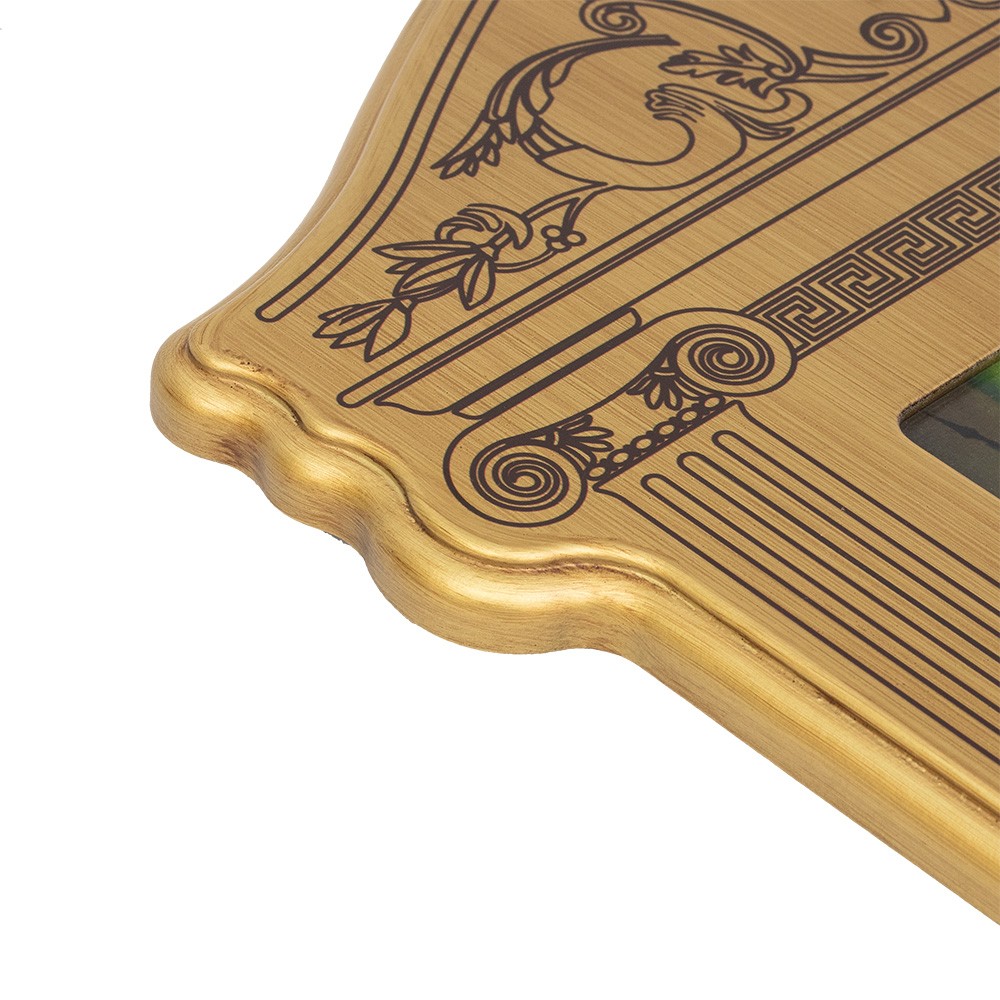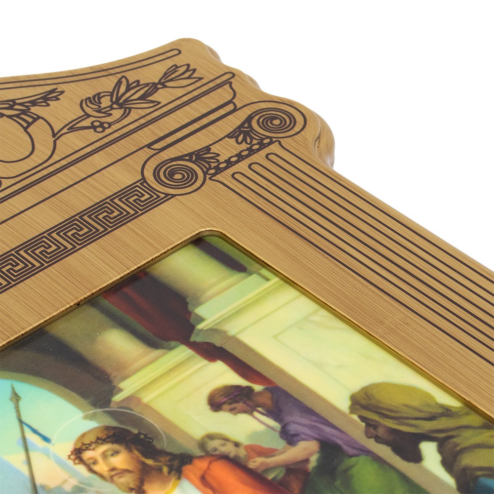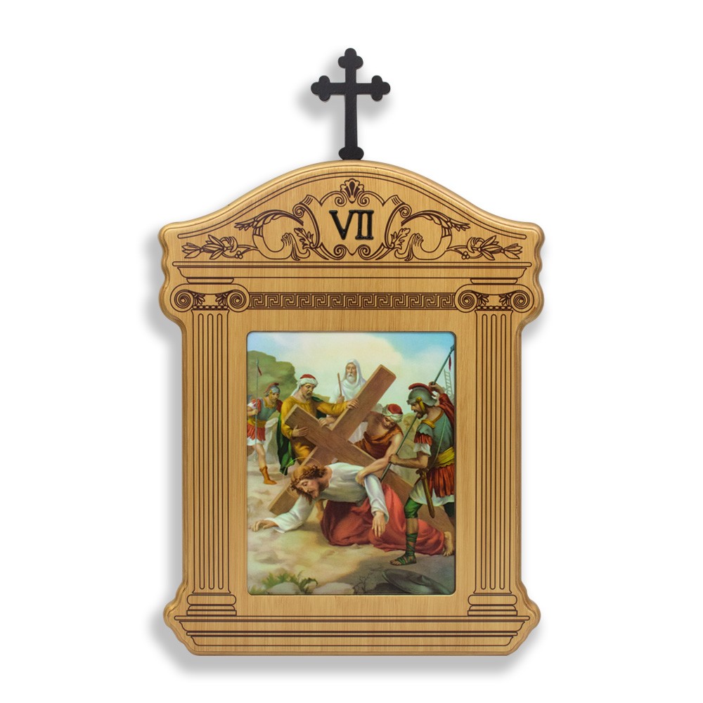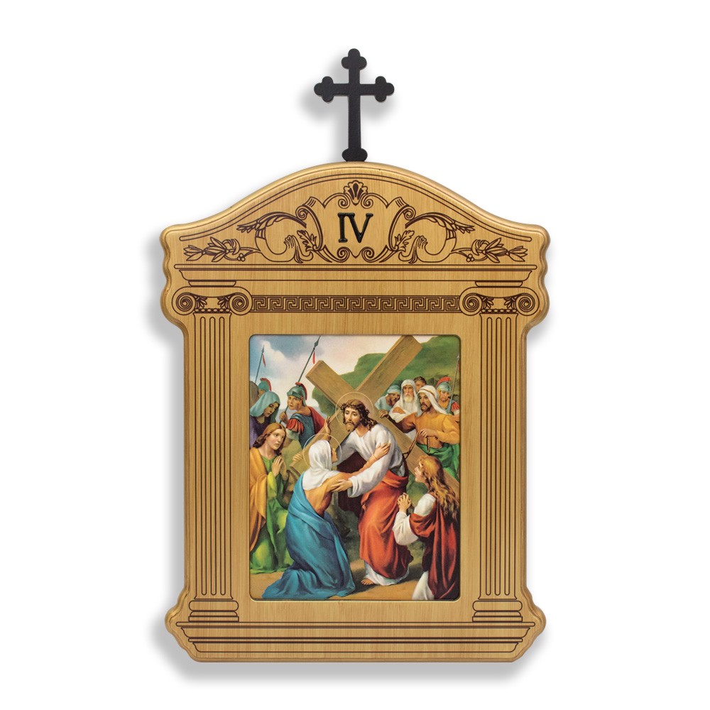 Way of the Cross printed on molded wood boards with the shape of a temple.