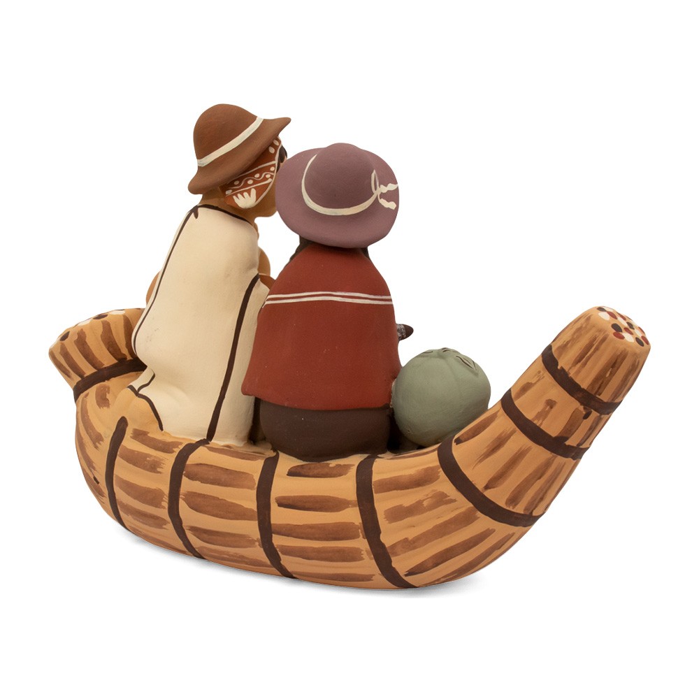 Adorable nativity scene in terracotta placed on a small boat, painted with natural colors.