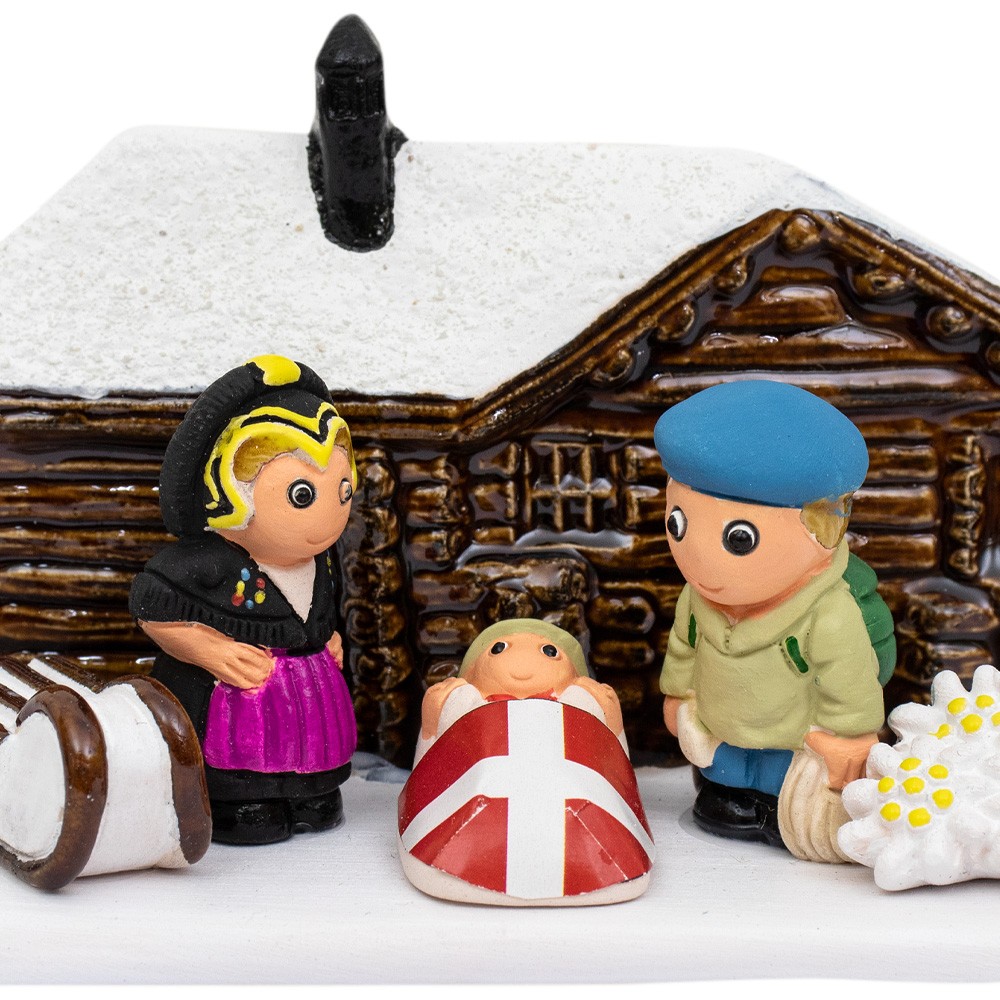 Mini ethnic nativity scene in semi-glazed ceramic, depicting Switzerland, part of the Kenty Collection (Nativity Scenes of the World).